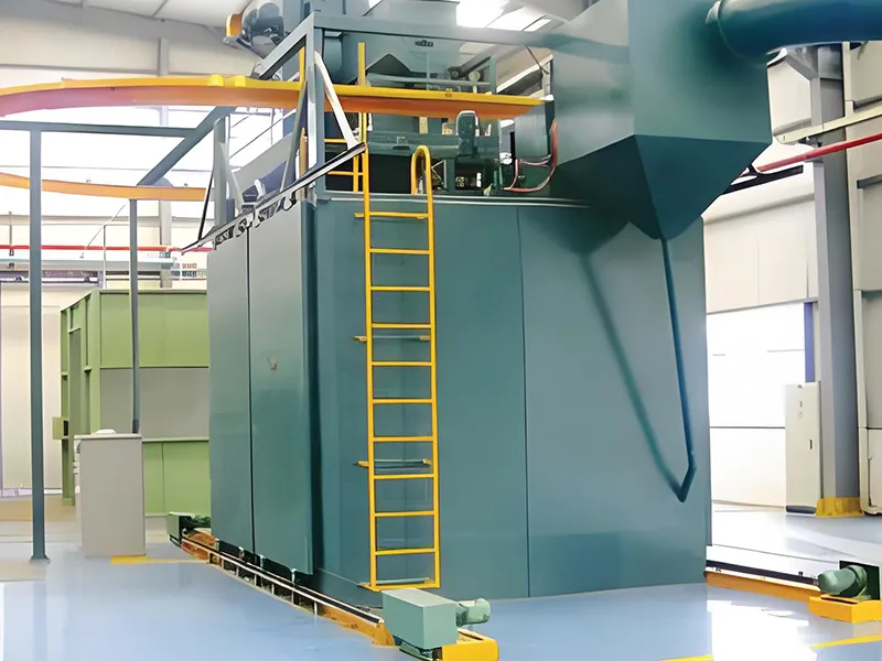 Дробеметная установка с подвесными крюками отличается большим расходом дроби, высокой эффективностью обработки, компактной структурой, большим пространством камеры и т.д. Данная установка может использоваться для очистки деталей различной формы.